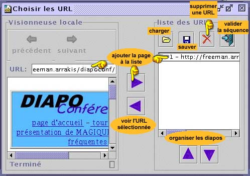 bouton Cette interface vous permet de construire vos listes d'URLs. Pour cela vous disposer d'une visionneuse locale afin de choisir vos pages avant de les ajouter dans la liste. Vous pouvez ensuite organiser votre séquence avec les boutons de positionnement. La séquence que vous allez