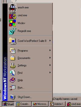 Sur un système d'exploitation comme Windows 95© ou Windows NT©, lancez d'abord une session DOS. Un moyen de procéder est de cliquer sur le bouton "Start" de la barre des taches en bas à gauche de l'écran. Vous devriez voir apparaitre un menu similaire à celui ci-dessous. Recherchez ensuite l'icone "MS DOS" :