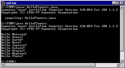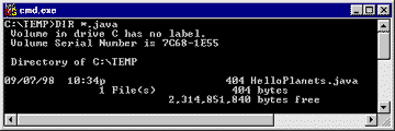 Etape 6: Exécution du programmeSi il y a trop de fichiers dans un répertoire, utilisez la commande DIR *.java pour ne visualiser que les fichiers se terminants par .java ![]() Pour achever l'étape 6, il ne nous rste plus qu'à compiler et exécuter le programme :
